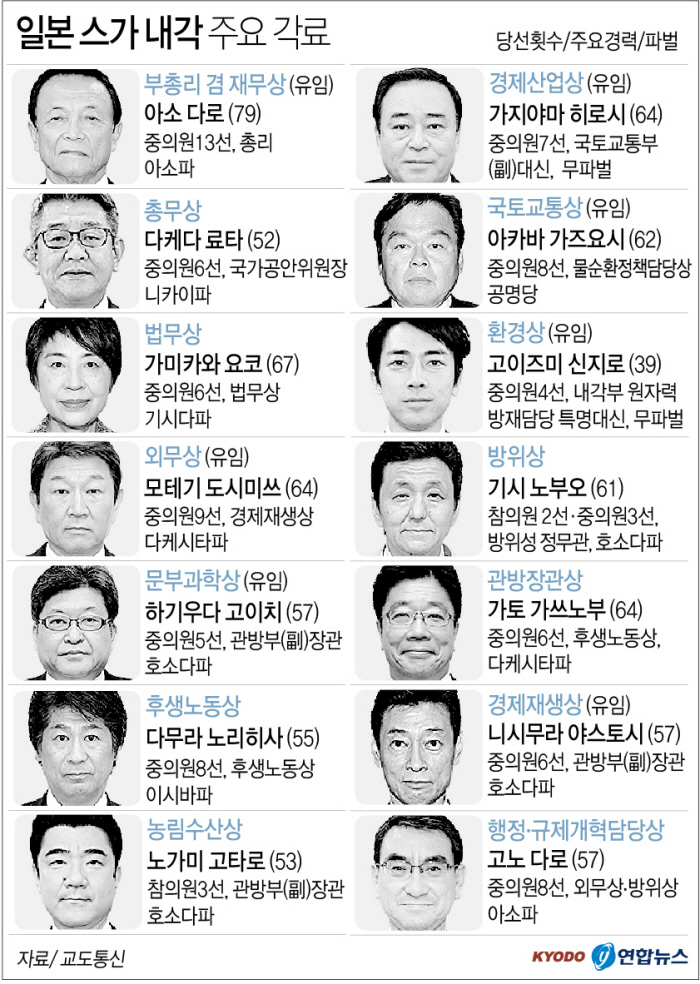 예상대로 아소 다로(麻生太郞) 부총리 겸 재무상, 모테기 도시미쓰(茂木敏充) 외무상, 하기우다 고이치(萩生田光一) 문부과학상, 가지야마 히로시(梶山弘志) 경제산업상 등 아베 내각의 핵심 각료는 그대로 머물렀다. ‘반 아베’ 고이즈미 신지로(小泉進次郞) 환경상도 유임된다. 올림픽상, 경제재생산 등도 바뀌지 않았다.
