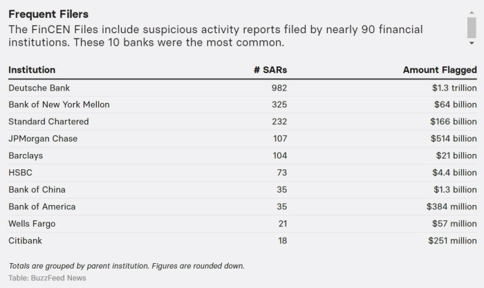 특히 대형 은행들의 연루 사실이 낱낱이 드러났다. 거래 건수와 액수로는 도이체방크가 압도적이다. SAR에 기록된 것이 982건이며 총 금액은 1조3000억달러에 이른다. 자료에 따르면 도이체방크는 범죄조직과 테러범, 마약밀매범 등이 검은 돈을 세탁하도록 허용했다. 이란 ‘고객’들의 자금관리를 돕기 위해 암호를 내줬고, 심지어 경영진이 직원들에게 미 당국을 피해갈 방법을 개발하라 종용하기도 했다. 1999~2006년 이란·시리아 자금 110억달러의 이동을 도운 것으로 나타났다.