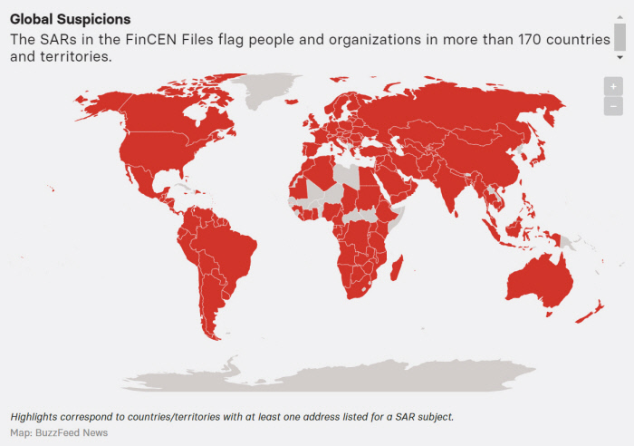 미국 온라인매체 버즈피드는 재무부 산하 금융범죄단속네트워크(FinCEN)가 취합한 세계 170여개국 ‘미심쩍은 금융거래’ 1만8000여건을 담은 파일 2100여개를 입수해 20일(현지시간) 보도했다. 파나마페이퍼스, 파라다이스페이퍼스 등을 폭로한 국제탐사보도언론인협회(ICIJ)와 함께 분석한 이 자료들에는 총 2조 달러에 이르는 세계의 수상한 금융거래 1만8000여건의 흐름이 망라돼 있다. 대부분은 2011~2017년 자료이지만 일부는 1999년 것도 있다.