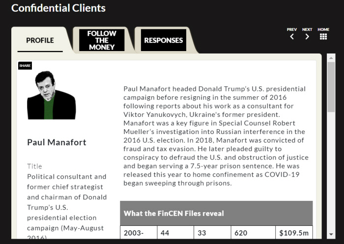 도널드 트럼프 대통령의 선대본부장이었던 폴 매너포트도 리스트에 포함됐다. 매너포트는 2016년 대선 때 트럼프 캠프를 총괄했으나 우크라이나 친러 정부, 러시아 정부·정보기관과의 유착설에 사퇴했다. 그는 2003~2017년 만들어진 총 33건의 보고서에 44개 은행 620건의 거래가 보고됐다. 총 거래금액은 1억1000만달러에 이른다. 일례로 2017년 JP모건체이스가 키프로스 등지의 유령회사들에 송금을 했는데, 그 중에는 우크라이나에서 2014년 쫓겨난 친러계 대통령을 도운 컨설팅회사가 포함돼 있었다. 매너포트는 우크라이나 친러 정권을 자문해주며 거액을 받은 것으로 드러났고, 2018년에는 사기와 탈세로 유죄 판결을 받았다.