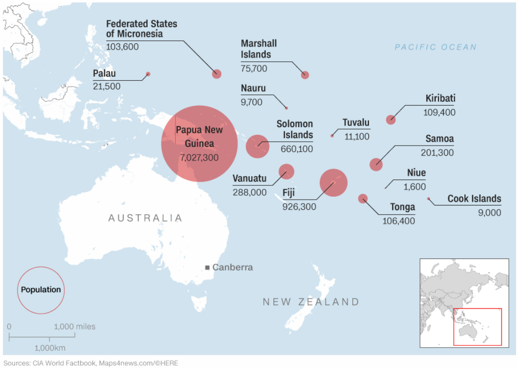 현재 오세아니아 14개국 가운데 호주, 뉴질랜드를 비롯해 10개국이 중국과 수교했다. 호주와 뉴질랜드를 빼고도 이 지역에는 파푸아뉴기니 8만명, 피지 2만명 등 중국인 이민자들이 상당수 들어가 있다. 중국이 적극적인 포섭에 나서면서 지난해 9월에는 대만 편이던 솔로몬제도가 결국 타이베이와 관계를 끊고 중국의 손을 잡았다. 올 6월에는 키리바시에도 중국 대사관이 문을 열었다.