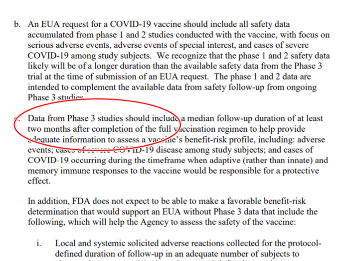 FDA는 6일(현지시간) 코로나19 백신의 효과와 위험 여부를 판단하기 위해 3상 임상시험 뒤 제약사들이 최소 2달의 안전성 정보(Safety Data) 확보기간을 두고 시험대상자들을 추적하도록 한 긴급사용 승인기준을 발표했다. 백신을 접종받은 집단의 코로나19 감염률이 플라시보(가짜 약)를 투약한 위약 대조군의 50% 아래로 낮아야 승인한다는 조항도 담겼다.