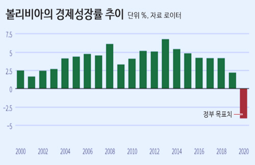 주산업이 농업이고 천연가스 수출에 수입을 의존하는 볼리비아는 특히 올해 코로나19로 경제적인 타격을 입었다. 가스와 대두 수출이 줄어든 탓이다. 앞서 브랑코 마린코비치 경제장관은 올해 성장률을 -4%로 예상했으나 세계은행은 -6%로 봤다. 로이터는 올들어 7월까지만 -7.9%에 이르렀다고 보도했다. 공식 실업률은 11.8%인데 실제 상황은 더 나쁠 것으로 보인다.