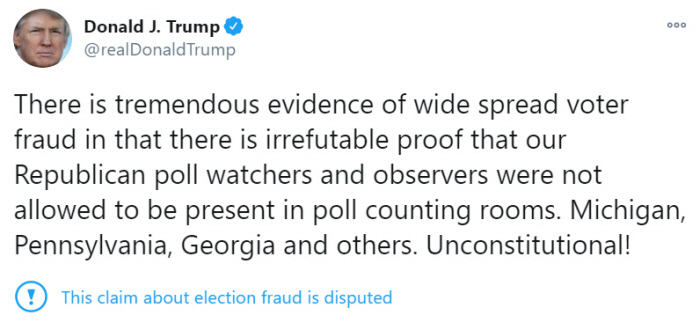 법정 다툼은 트럼프 대통령에게 불리한 방향으로 향하고 있다. 트럼프 캠프는 펜실베이니아주 몽고메리 카운티와 필라델피아 카운티의 사전투표 9000표를 무효화해달라는 소송 6건에서 13일 패소했다. 트럼프 캠프의 소송을 맡아온 로펌조차 발을 빼기 시작했다고 CNN은 보도했다. 미시간주에서도 공화당 측 선거감시단이 디트로이트 투표 검증을 중단해달라고 소송을 냈으나 법원이 ‘선거부정’ 주장을 거부하며 기각했다.