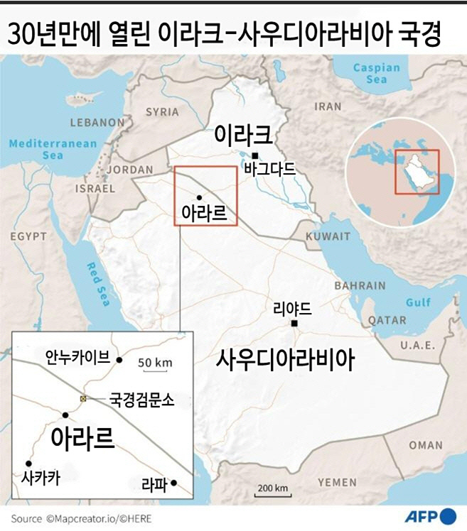 18일(현지시간) 이라크와 이어지는 사우디 북부 아라르 국경검문소가 문을 열었다. 오트만 알가니미 이라크 내무장관과 압둘아지즈 알샴리 이라크 주재 사우디 대사 등 양국 관리들이 국경을 걸어서 넘었고, 줄지어 대기하고 있던 트럭들이 양국을 오가기 시작했다고 알자지라방송 등은 보도했다.
