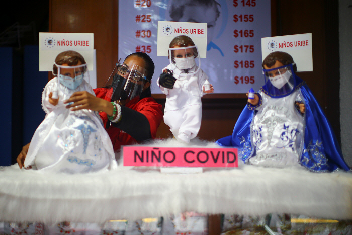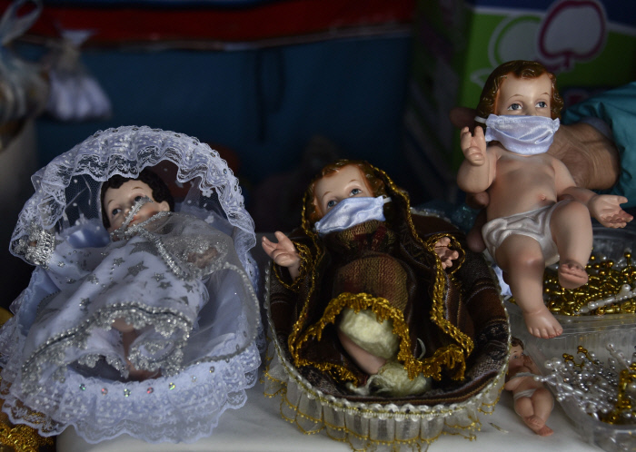 멕시코의 아기예수도 마찬가지입니다. 아래 사진은 9일 멕시코시티의 한 상점에서 직원이 마스크를 쓰고 약병을 든 ‘니뇨 코비드(코로나 아기예수)’ 인형들을 진열대에 놓는 모습입니다.
