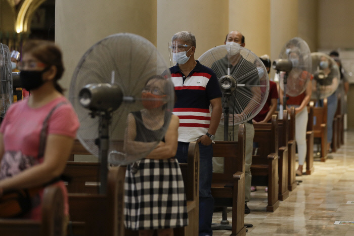 15일 필리핀 마닐라 외곽 퀘손시티의 콘셉션대성당에 신자들이 모여 있습니다. 이 성당에서는 12월 16일부터 24일까지 아흐레 연속으로 성탄 미사를 드리는 전통을 100년 넘게 이어왔습니다. 올해는 신자들 모두 마스크를 써야 하고, 환기를 위해 두 줄 간격으로 선풍기를 틀어놨습니다.