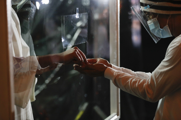 미사 도중 성체를 나눠주는 신부님과 신자 사이엔 플라스틱 칸막이가 설치됐네요.