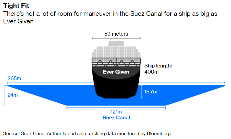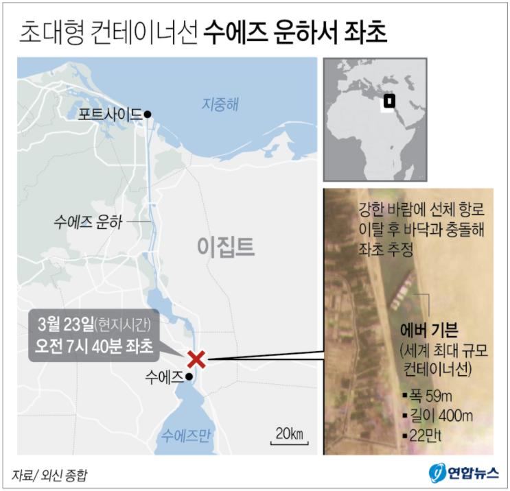 배는 중국에서 출발해 네덜란드로 향하는 중이었다. 폭 59m, 길이 400m, 무게 22만4000톤. 무려 컨테이너 2만개를 싣고 다니는 거대한 배다. 미국 언론들은 이 배를 세로로 세우면 뉴욕 엠파이어스테이트빌딩 높이라고 보도했다. 바람이 강하게 불면서 선체가 항로를 이탈했고 바닥에 충돌한 것으로 선사에서는 설명하고 있다. 뱃머리 한쪽은 제방에 박혔고 한쪽은 반대쪽 제방에 걸쳐진 상태로 운하를 가로막고 있다. 다행히 선원들은 무사하고 해양 기름유출 같은 일은 없었다.
