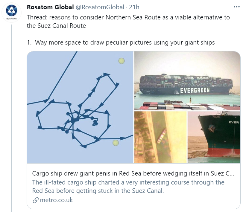 북유럽과 동아시아 간에는 이론적으로는 북해 항로로 우회하는 것도 가능하다. 러시아는 슬그머니 북해항로를 홍보하면서 선사들에게 손짓을 하고 있다. 블라디미르 푸틴 러시아 대통령은 유럽에서 러시아 동부 시베리아 해안까지 잇는 항로를 열어보려고 애써왔다. 수에즈 운하에서 사고가 나자 러시아 핵에너지국인 로사톰(Rosatom)은 25일 "북해 항로를 수에즈의 대안으로 고려해볼 수 있지 않느냐"는 글을 트위터에 올렸다.