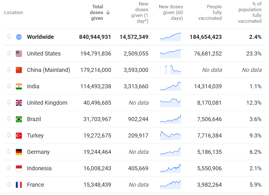 인구 대비 접종자 비율을 살펴보면 인구가 아주 적은 소국들을 제외하고 이스라엘(54%), 바레인(28%), 칠레(26%), 미국(23%), 아랍에미리트연합(22%) 등의 순이다. 미국은 이미 성인 기준으로 보면 절반이 1번 이상 접종을 받았고 2차 접종까지 끝난 사람이 30%를 넘었다고 CNN이 15일 보도했다. 세계무역기구(WTO)는 14일 글로벌 백신 제조사들에게 부국과 개도국들 간 백신 공급 격차를 줄이는 데에 힘써달라고 호소했다. 응고지 오콘조-이웨알라 WTO 사무총장은 지난달에도 회원국들에게 백신 수출제한을 풀고 통관 절차를 줄여달라고 했었다.