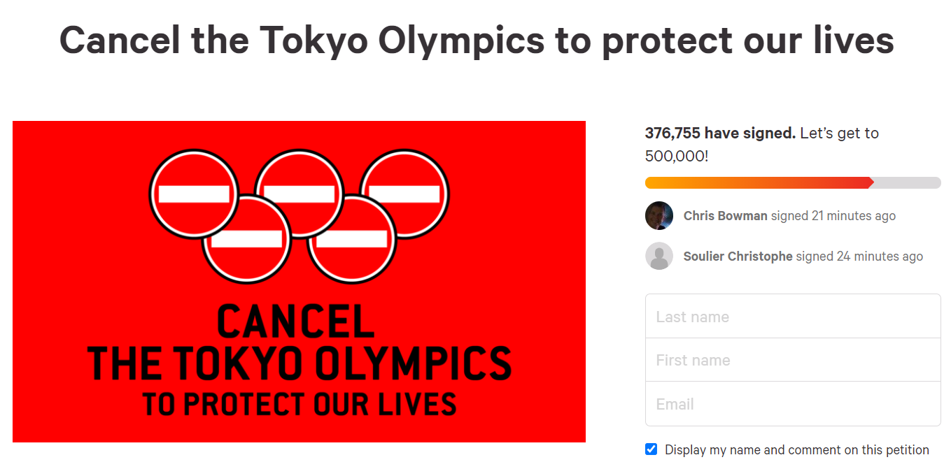 도쿄 올림픽을 개최해선 안 된다는 온라인 청원에는 2주만에 375,000명이 서명했다. 지난 5일 우쓰노미야 겐지 전 일본변호사연합회장이 국제 청원사이트인 ‘체인지닷오알지’(Change.org)에 올린 청원이다. 도쿄 중심부에서는 올림픽 취소하라는 거리 시위까지 등장했다.