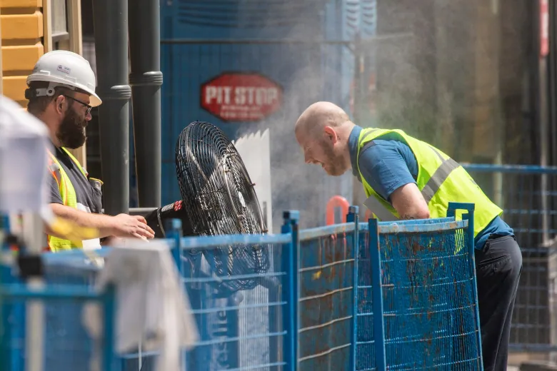 A construction worker uses a misting fan to cool down at a work site in Vancouver on Monday. Vancouver police say they have responded to more than 100 sudden deaths since the heat wave took hold.  (Ben Nelms/CBC)