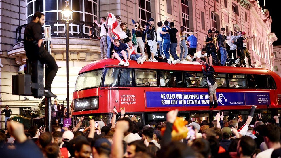 7일 경기 뒤 영국은 광분에 휩싸였다. 시민들은 밤새 거리에서 축제를 벌였고, 발 디딜 틈 없이 거리를 메운 축구팬들의 모습이 카메라에 잡혔다. 흥분한 이들은 시내버스 지붕 위에까지 올라가 열광했다. 2016년 브렉시트를 결정한 이후 유럽의 애물단지로 전락한 영국이 축구로 권토중래한 듯한 모습이다.