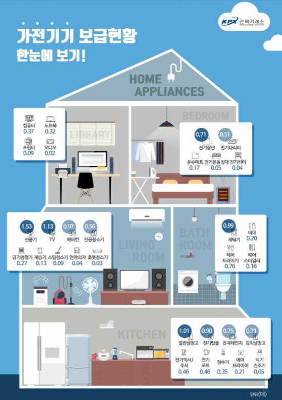전력거래소 보고서에 실린 그림을 보면서, 우리집에 있는 가전제품들을 세어봤다. 그림에 나온 것들 중 18개가 있다. 그 중에 진공청소기, 김치냉장고, 정수기는 빌트인인데 한번도 쓴 적 없지만 그것들 빼도 15개. 정말 많구나.