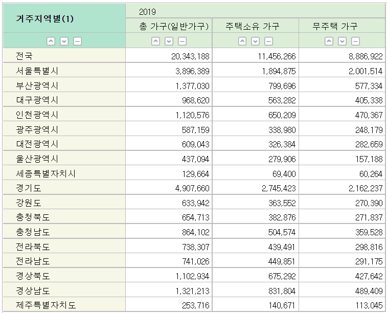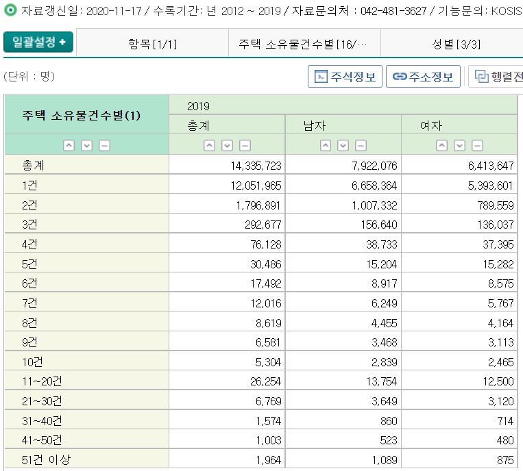시대적 특혜 얘기가 많이 보여서 2019년 주택소유통계를 찾아봄.