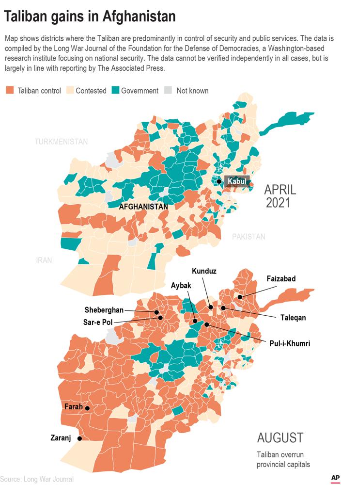 미군은 이런 가운데에도 이달 말까지 철수를 완료할 계획이다. 탈레반을 겨냥해 일부 공습을 감행했지만 지상전에는 관여하지 않고 있다. 이런 상황에서 탈레반과 맞부닥친 아프간 정부군은 처참하게 무너지고 있다. 탈레반에 점령당한 파라 주 의원이 12일 AP에 전한 내용을 보니 탈레반 전사들이 "신은 위대하다"고 외치며 피투성이가 된 보안대원의 시신을 거리로 끌고 다니고 있다고 한다. 탈레반 전사들은 미군에게서 흘러나온 M-16 소총을 들고 험비와 포드 픽업트럭을 몰고 다니며 거리를 누비고 있다.