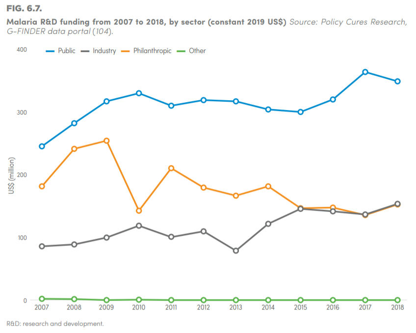 감기 백신이 없는 것처럼, 기본적으로 말라리아를 일으키는 원충이 다양해서 백신을 개발하기 힘들었던 것이 사실이다. 하지만 그럼에도, 말라리아 백신을 지금껏 만들지 못했던 것은 결국 '빈국들의 질병'이기 때문이라는 비판이 많았다. 부자 나라들에서 심각성을 못 느끼는 질병이라는 점, 개발 시간이 오래걸리는데다가 수익을 추구할 수 없어 투자비용을 회수하기 어려운 점 등으로 해서 기업들이 외면했다는 것이다. 실제로 말라리아 관련 R&D 규모를 보면 공적 기금과 기부금이 많고, 기업들의 투자는 적었다가 요 몇년 사이에 좀 늘어난 수준이다.