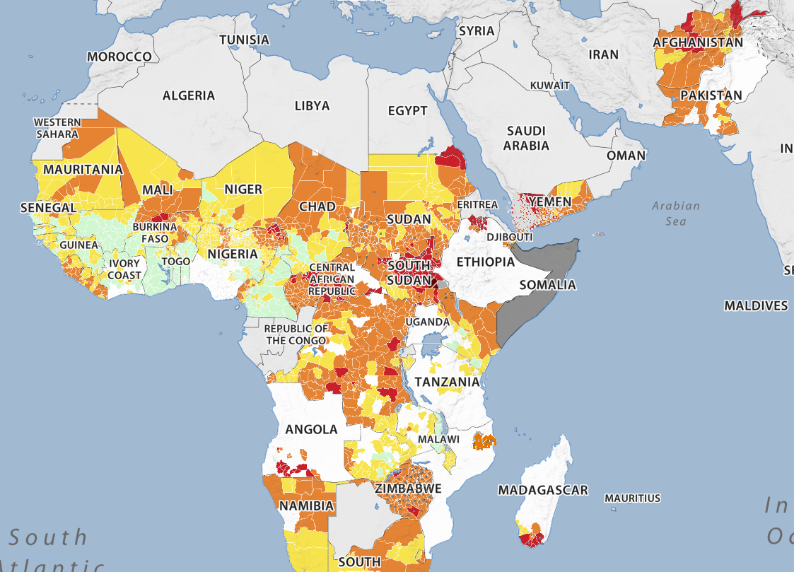 세계 여러 지역들의 식량위기 상황을 모니터링하는 ‘통합 식량안보 단계분류(IPC)' 프로그램은 식량위기를 다섯 단계를 구분한다. 1단계 정상(Minimal), 2단계 경고(Stressed), 3단계 위기(Crisis), 4단계 비상(Emergency), 5단계 기근(Famine). 3단계 ‘위기’ 이상인 지역을 살펴 보면 아시아에서는 아프간과 예멘 일부가 해당된다. 이유는 뻔하다. 내전 탓이다. 그 외에는 전부 아프리카 국가들인데 역시 대개는 소말리아, 남수단 등 분쟁이나 정정불안이 이어져온 지역이다.