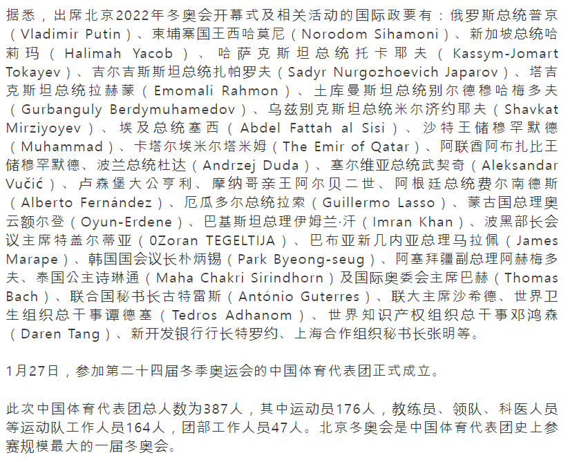 영국 호주 캐나다는 중국의 인권 문제를 거론하면서 미국의 외교 보이콧에 동참한다고 이미 발표했고, 뉴질랜드 네덜란드 스웨덴 호주는 코로나19를 핑계로 정상이 참석해달라는 초청을 거절했다. 외교 보이콧이 아니더라도 원래 동계올림픽 개막식에 정상급 참석은 많지 않다. 평창 동계올림픽 때 ‘정상급’ 외빈은 20명 정도였다. 당시 아베 신조 일본 총리가 왔었고 미국에서는 마이크 펜스 당시 부통령이 참석했다. 그 때 펜스 부통령은 북한 김여정 노동당 부부장을 노골적으로 무시하는 정치적 제스처를 보이기도 했다.