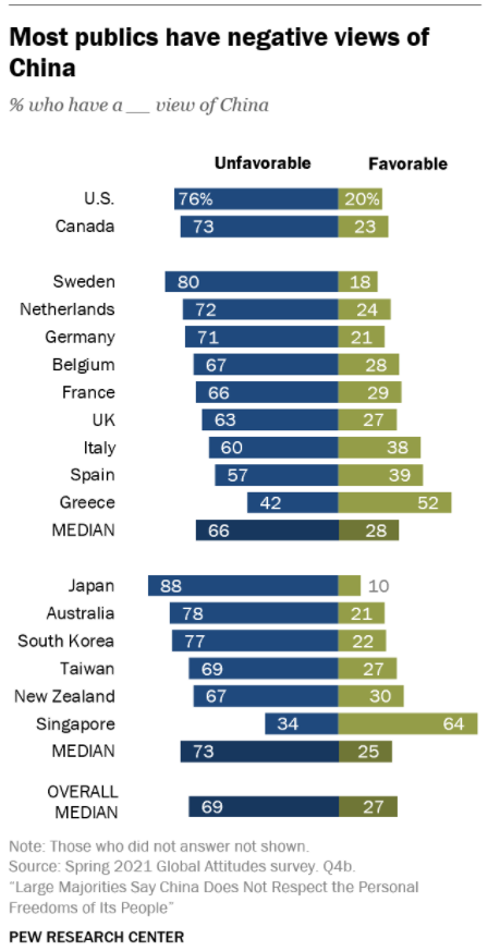 올림픽은 국가의 위신을 높여주는 행사다. 중국이 이번 올림픽으로 세계의 반중 정서를 좀 누그러뜨릴 수 있을까? 미국 퓨리서치센터는 지난해 실시한 17개국 여론조사 결과를 최근 발표했다. 여론조사들에서는 각국의 반중국 정서가 높다는 것이 그대로 드러났다. 가장 높은 나라는 일본이었다. 무려 88%, 10명 중 9명이 중국에 대해 비우호적인 감정을 표출했다. 중국에 대해 악감정을 보이지 않은 나라에서도 중국의 인권상황에는 비판적인 반응이 나왔다. 이를 테면 싱가포르에서는 64%가 중국에 대해 긍정적인 시각을 보여줬지만 동시에 60%가 '중국이 자국민들의 자유를 존중하지 않는다'고 답했다.