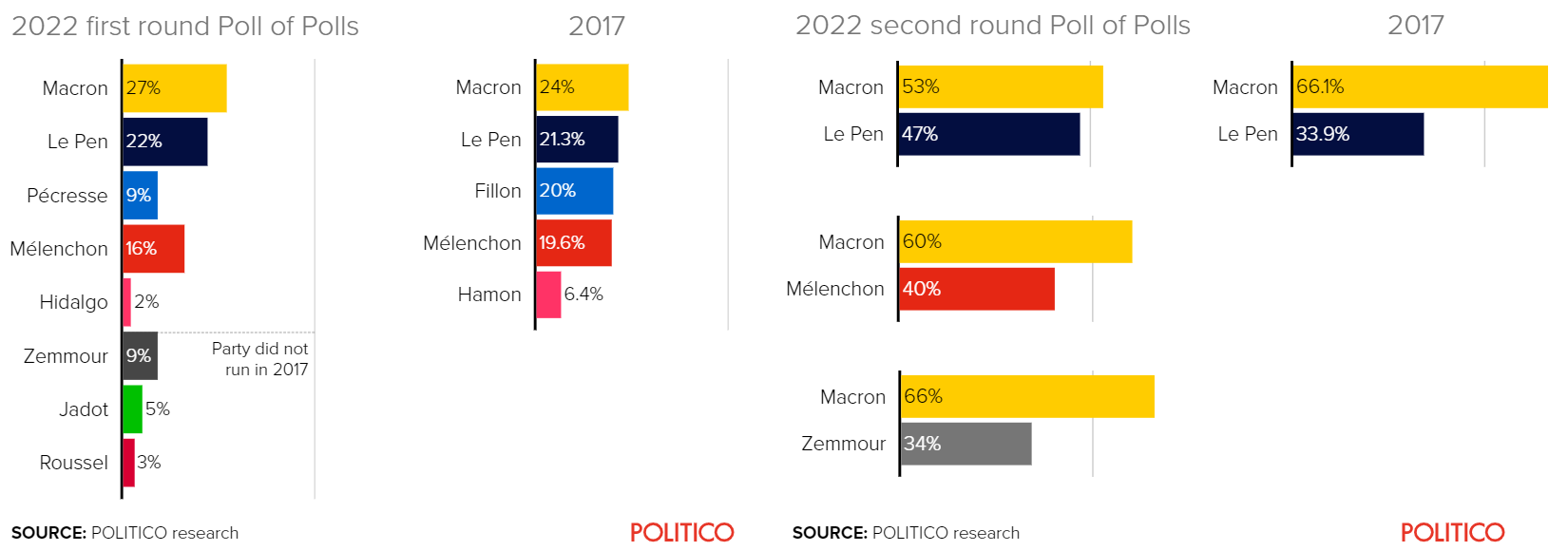 주된 경쟁자는 극우 국민전선의 마린 르펜, 좌파 장 뤼크 멜랑숑, 또 다른 극우파 후보 에릭 제무르, 2000년대 중도우파 니콜라 사르코지 정부 때 장관을 지낸 발레리 페크레스 등이다. 정치전문매체 폴리티코 유럽판 집계를 보니 여론조사 지지율은 마크롱 27%, 르펜 22%, 멜랑숑 16%, 제무르 10%, 페크레스 9% 순이고 나머지는 5%를 밑돈다.