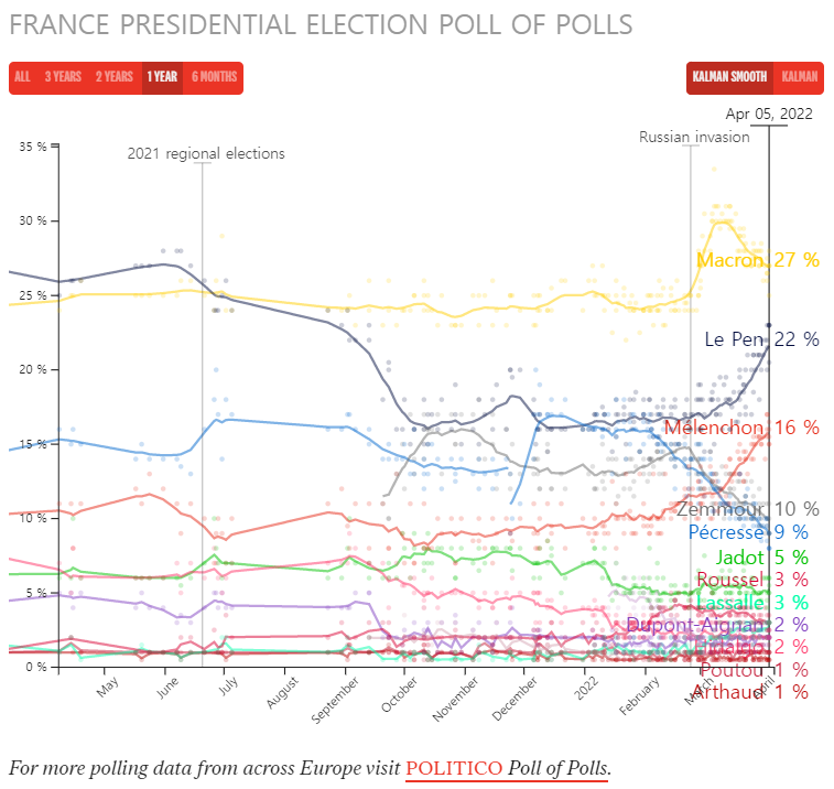 마크롱과 르펜의 지지율 차이가 몇 %포인트 안 난다. 압도적인 지지를 얻는 후보는 없고 다들 고만고만한 형편이다. 마크롱 대통령조차 재선을 확신하기는 힘들어 보인다. 특히 르펜의 추격이 무섭다. 러시아가 우크라이나를 침공한 뒤 마크롱의 지지율은 한때 30%까지 올라갔다가 그 뒤에 주춤한 반면, 르펜은 3월부터 계속 상승세다.