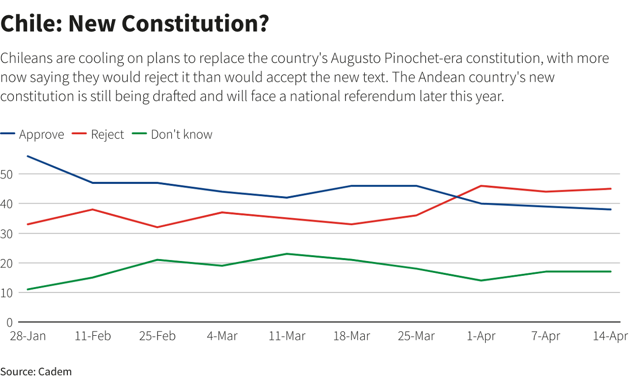 불평등에 대한 시민들의 분노는 몇 년 간의 시위를 통해 확실하게 표출됐다. 그러나 광물을 판 돈으로 격차를 줄이고, 교육과 의료를 개선하고, GDP의 0.35%에 불과한 과학기술 투자를 늘려 제조업을 키우고, 원주민 자치를 늘리고, 환경을 좀 더 지키고, 젠더 다양성과 인권 수준을 높이는 일들을 ‘점진적으로’ 하는 게 낫다고 생각하는 이들이 더 많을 수 있다. 초안이 공개되기 전인 지난달, 여론조사기관 카뎀의 조사에서 유권자 46%가 헌법안에 반대할 것이라고 답했다. 석달 새 13%포인트나 올라간 수치였다. 반면 지지율은 56%에서 40%로 낮아졌다. 악티바 여론조사에서도 '거부'가 '지지'보다 근소하게 높았다. 로이터 등의 분석에 따르면 재산권에 대한 걱정, 연기금제도의 변화에 대한 우려가 컸다.