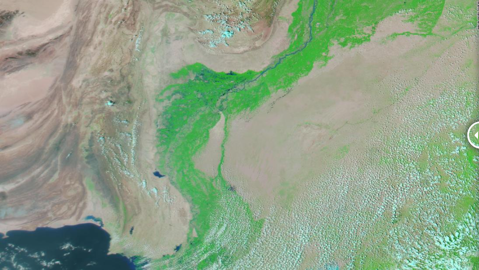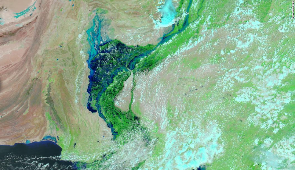 이번 홍수 때문에 파키스탄의 내륙에는 호수 아닌 호수가 생겨났다. 8월 28일 미 항공우주국(NASA) MODIS 위성이 촬영된 사진들이 공개됐는데, 신드 주에 폭우가 내리고 인더스 강이 범람하면서 폭 100km의 호수가 생겨난 것이 확인됐다. 원래는 농경지였는데 침수된 것이다. 빌라왈 부토 자르다리 외교장관은 신드를 방문한 뒤 “마른 땅을 찾아볼 수가 없다”고 했다. 셰리 레흐만 기후변화장관은 “이번 상황(몬순)이 끝날 즈음에는 국토의 3분의1이나 4분의 1이 물에 잠겨 있을지도 모르겠다”고 했는데, 근거 없는 우려가 아니다. 유엔이 “이대로 기후변화가 계속되면 파키스탄 3분의 1이 잠긴다” 경고한 바 있으니.