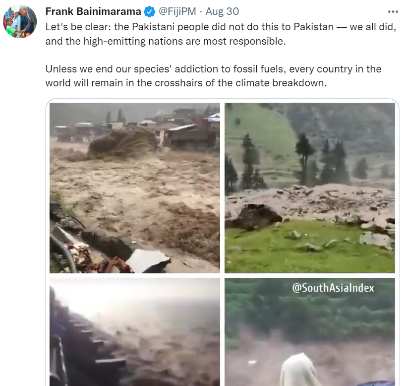 기후변화를 많이 일으킨 나라들이 책임을 더 짊어져야 하는 것은 분명하다. 해수면이 올라가면서 가라앉을 위험에 처한 남태평양 섬나라 피지의 프랭크 바이니마라마 총리는 파키스탄 홍수를 보면서 트위터에 이런 글을 올렸다. “분명히 하자. 파키스탄 사람들은 파키스탄에 이런 짓을 하지 않았다. 우리 모두가 한 일이지만 특히 온실가스를 많이 내뿜는 나라들에게 가장 큰 책임이 있다.”