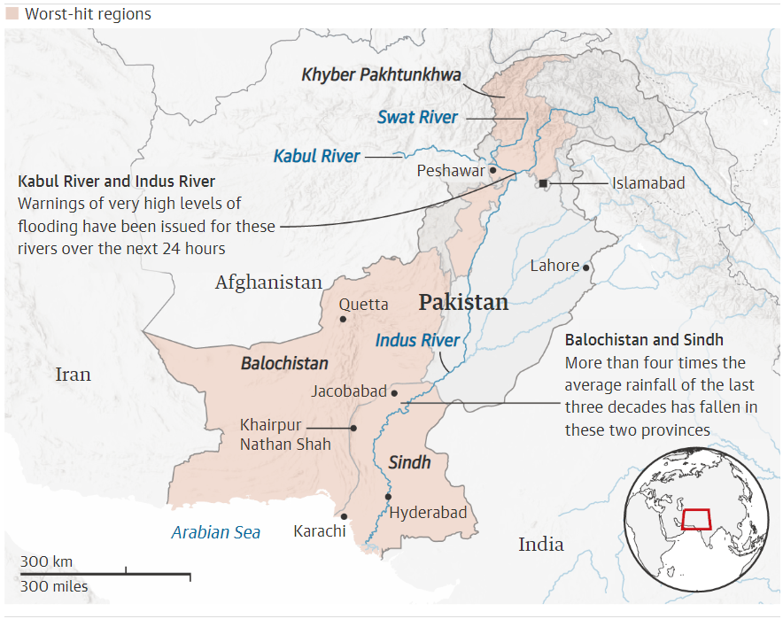 파키스탄 기상청에 따르면, 올해 몬순으로 1961년 기록이 시작된 이래 가장 많은 비가 쏟아졌다. 아라비아해와 면한 신드 주와 발루치스탄 주의 피해가 특히 컸는데, 이 두 지역의 강우량은 어마어마했다. 신드에는 이번에 8월 평균 강우량의 8배, 발루치스탄은 5배에 이르는 비가 왔다. 방글라데시와 인도 쪽도 물론 강우량이 많았고.