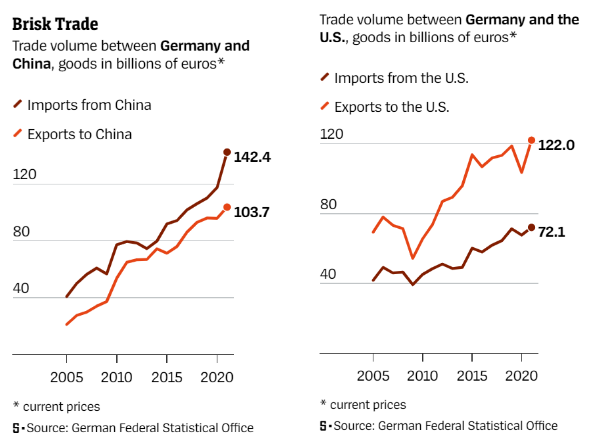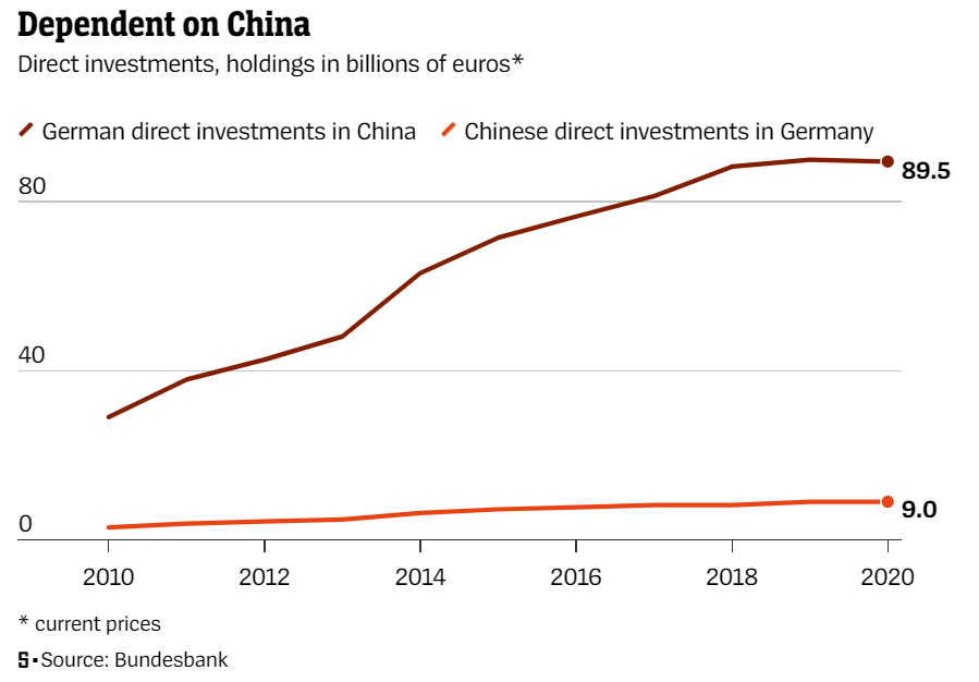 독일 시사잡지 슈피겔은 "2005년부터 독일과 중국의 교역량은 4배로 늘었으나 그 기간 중국은 전면적인 독재체제로 바뀌었다"며 "시장을 열어 개혁으로 이끈다는 서구의 희망은 물거품이 됐다"고 진단했다. 하지만 독일 기업들 분위기는 다르다. 녹색당 소속인 로베르트 하베크 경제장관이 지난달 기업 경영자들을 모아놓고 중국과의 '순진한 거래'에 대해 경고했으나 독일산업연맹(BDI)과 기업 대표들은 "중국 시장은 단순히 그 규모 때문에라도 꼭 필요하다"며 맞섰다.