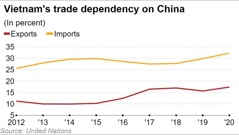 베트남에는 중국이 가장 큰 무역 파트너이며 중국에는 베트남이 6번째 교역국이자 아세안(ASEAN)에서 가장 큰 거래 상대다. 코로나19로 세계경제가 침체에서 벗어나지 못한 지난해에도 양국 교역액은 1658억달러에 이르렀다. 베트남은 수출의 17%, 수입의 32%를 중국에 의존한다. 베트남 국영통신 VNA에 따르면 대중국 수출은 지난해 560억달러로 20년 새 37배로 커졌다. 베트남이 수입하는 기계와 생산자재 94%가 중국에서 온다.