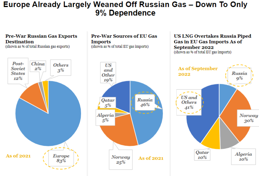 이 겨울이 지나도록 유럽에 저장된 가스의 최소 절반은 남아 있을 것이라고 한다. 올해 안에 앞으로 두 겨울을 쓸 가스를 쟁여둘 수 있을 것이고, 그와 연동돼 기름값도 작년보다는 안정될 것으로 관측된다. 러시아는 유럽시장을 스스로 내팽개쳤다. 중국으로 가는 가스관이 제 기능을 하려면 5년은 더 걸릴텐데 말이다.