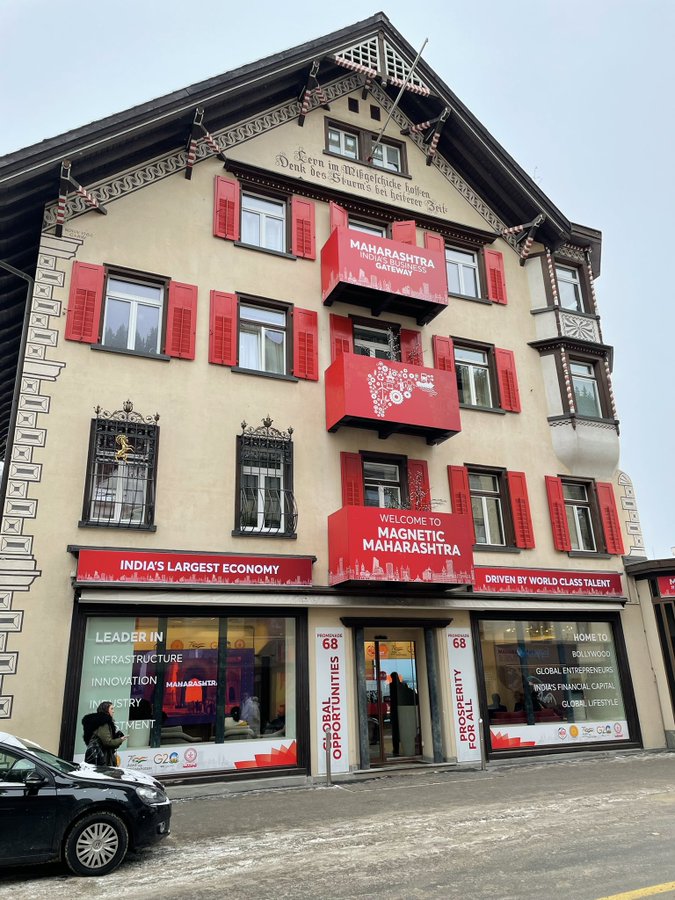 스위스 휴양지 다보스의 4층집. 빨간 발코니와 빨간 간판에 “인도 최대 경제 마하라슈트라” “웰컴 투 마하라슈트라”라는 글이 쓰여 있다. 해마다 이곳에서 열리는 세계경제포럼(WEF), 일명 ‘다보스포럼’에 맞춰 인도 마하라슈트라주가 매입한 건물이다.