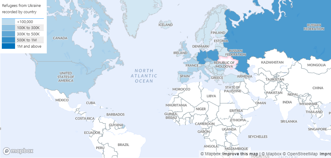 18~60세 남성들은 정부의 출국금지령과 자발적 결정 등으로 대부분 남았기 때문에 국외로 떠난 난민의 90%는 여성과 아동들이다. 폴란드, 슬로바키아, 헝가리, 루마니아, 몰도바 등 접경국으로 빠져나간 뒤 유럽의 다른 나라들로 이동한 이들이 많다. 유엔난민기구 자료에 따르면 우크라이나 난민들이 가장 많이 들어간 나라는 러시아(277만 명)다. 이어 폴란드(150만 명), 독일(100만 명), 체코(40만 명) 순이다.