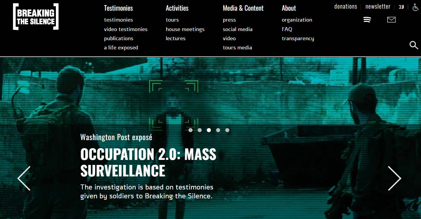 대표적인 예가 BtS다. 방탄소년단이 아니라 ‘침묵을 깬다(Breaking the Silence)’는 이름의 사회단체다. 히브리어로는 쇼브림 슈티카, 아랍어로는 카스르 앗삼트. 2004년에 전역군인들이 만든 조직이다. 팔레스타인 주민들을 인간방패로 삼고, 집을 약탈하고, 검문 과정에서 괴롭히는 등 점령지에서 군인들이 벌이는 악행을 폭로하는 것이 이 단체의 일이다. 2015년 네타냐후 총리는 의회 연설에서 이 단체를 대놓고 비난했고, 교육부는 이 단체 회원이 공립학교에서 강연하지 못하도록 하는 법안을 만들기도 했다.