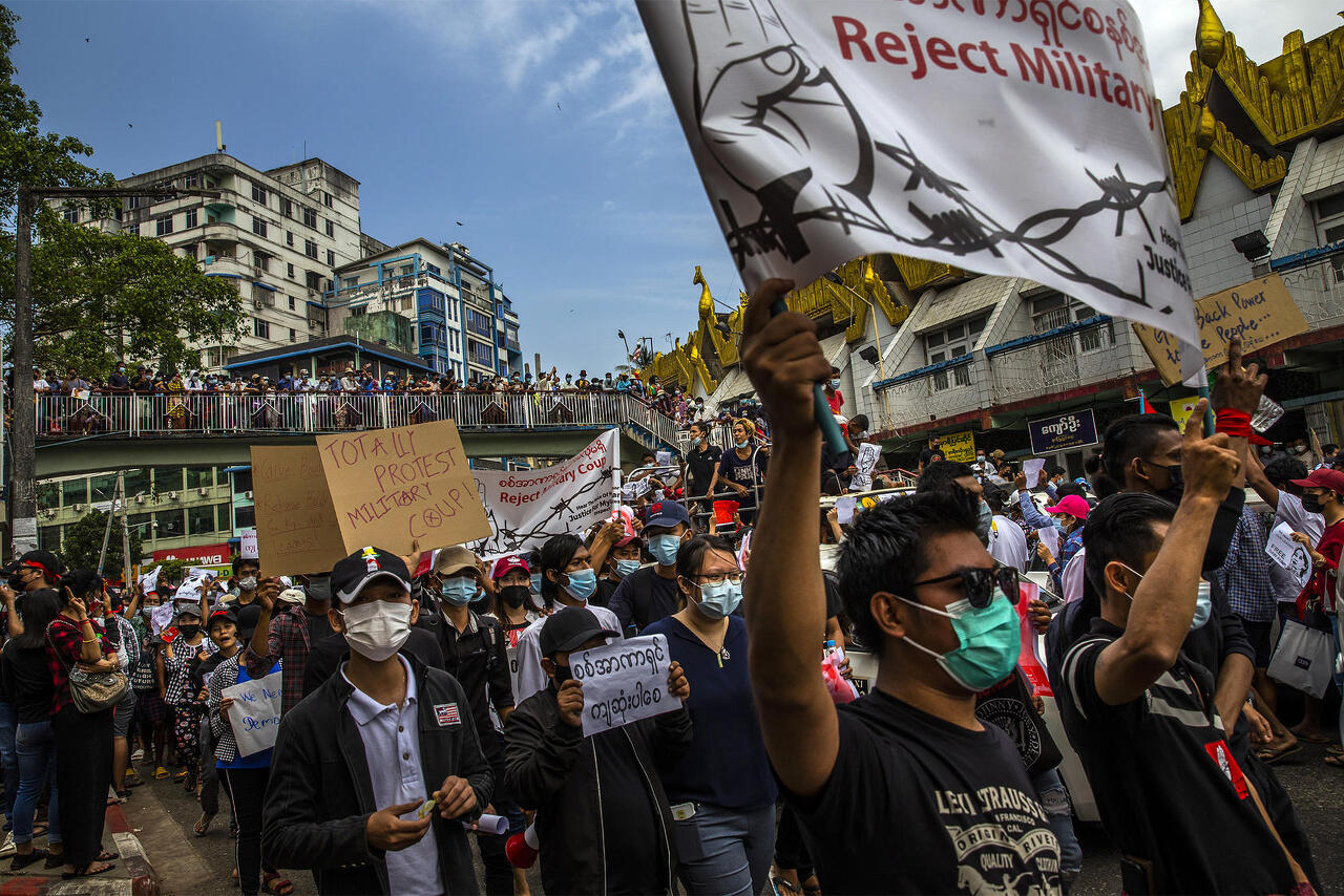 쿠데타 직후 세계에 비쳐진 모습, 세 손가락 항의 표시를 하는 평화시위대. 하지만 요즘 나오는 것들은 총탄에 맞은 시신, 불타버린 마을, 난민 가족의 이미지. 즉, 사실상 내전 상황.