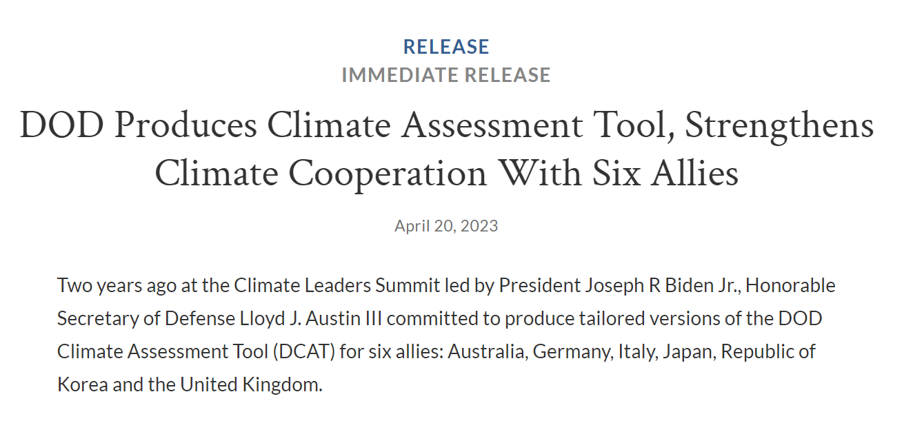 백악관이 회의를 열던 날, 미 국방부도 성명을 내놨습니다. 2021년 기후정상회의 때 미 국방부는 한국을 비롯해 호주, 독일, 이탈리아, 일본, 영국 등 6개 동맹국을 향해서 ‘국방부 기후평가도구(DCAT)’를 만들겠다고 했습니다. 20일 성명은 그것이 만들어졌다는 내용이었습니다. 국방 분야의 맞춤형 평가도구를 동맹국과 공유하면 안보 협력과 상호 운용성을 촉진할 수 있다면서 “기후 영향에 더 탄력적으로 대응하는 국가와 동맹이 경쟁 우위를 점하게 될 것”이라고 했습니다. 미국이 기후대응 능력을 키울 도구를 만들어 선물해주는 것이라는 듯이 설명하지만, 동맹국과의 기후안보 협력이 중요하다는 코멘트를 보면 우리도 채비가 필요하지 않을까 하는 생각이 듭니다. 그 어느 때보다 한미 동맹을 강조하는 정부라면 더더욱 말입니다.