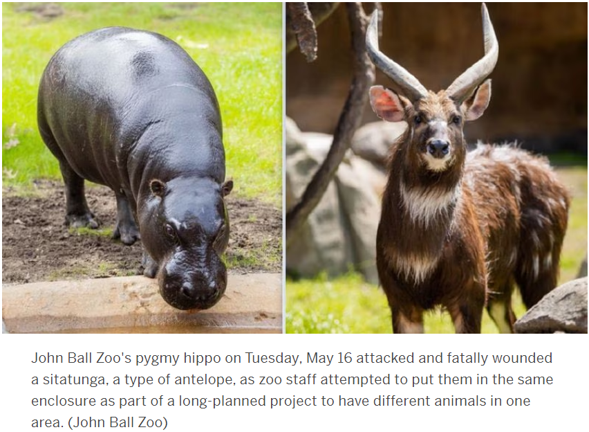 존볼 동물원 측은 6월 초 피그미하마를 관객들에게 선보이겠다며 락음악 페스티벌 ‘롤라팔루자’에서 따온 ‘히포팔루자’라는 이벤트까지 계획했다. 하지만 자하리의 새 서식지에는 안타깝지만 공생해야만 하는 상대가 있었다. 늪지대에 사는 시타퉁가였다. 둘 사이에는 울타리가 있었지만 자하리가 영양을 공격하는 걸 막지 못했다. 볼티모어에서 태어나 샌디에이고의 사파리공원을 거쳐 미시간에 정착했던 불쌍한 영양은 결국 죽었다. 두 동물 모두 인간의 서식지 파괴 속에 무리들이 줄어가는 종이었고 인간들에 의해 이 동물원 저 동물원을 떠도는 처지였는데 하나는 가해자가, 하나는 피해자가 됐다.