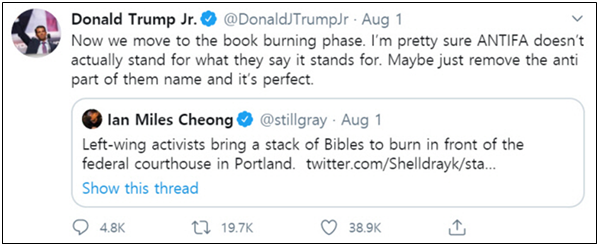 2020년 8월, 미국에서 ‘흑인 생명도 중요하다(BLM)’ 시위가 거세게 벌어지던 시기에 몇몇 매체에 ‘성경을 불태우는 시위대’에 대한 기사가 실렸습니다. 미국 우파 언론들은 일부 시위자들이 성경을 불태우는 영상을 반복해서 내보냈고 트럼프 당시 대통령도 소셜미디어 등에서 이 사실을 강조했습니다. 인종주의에 반대하는 시위대를 공격함으로써, 백인 우파들의 반시위 감정을 자극하려는 것이었지요.