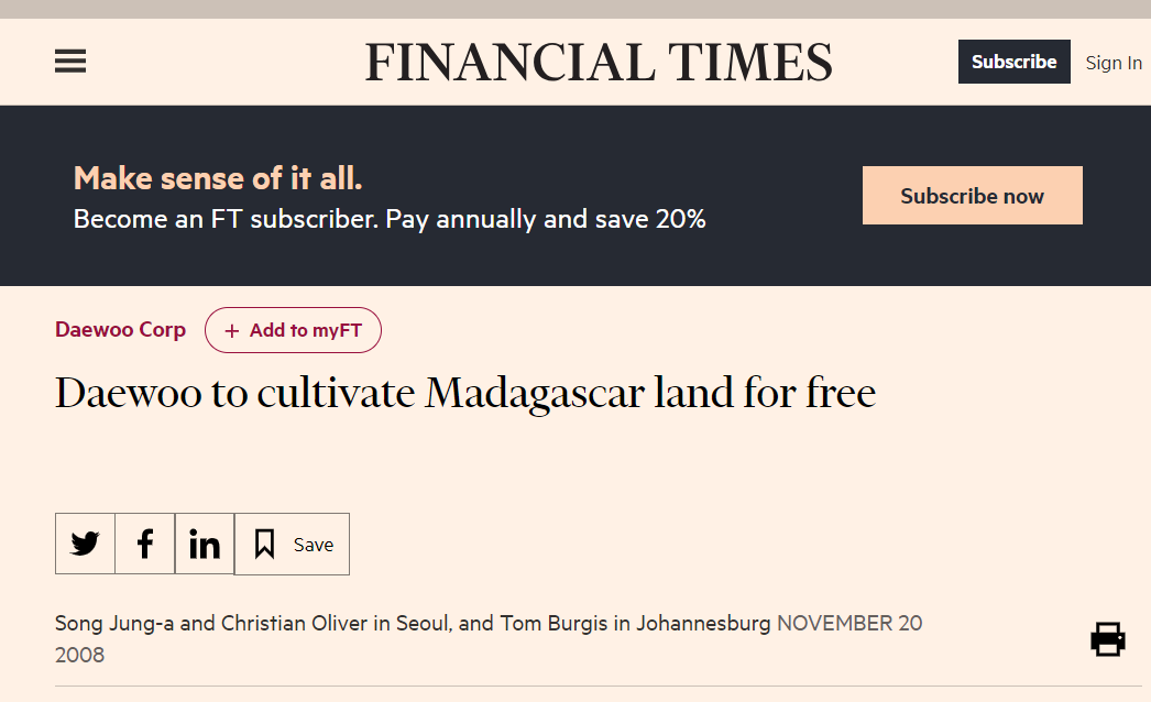 한국은 이미 국제사회의 중요한 플레이어입니다. 동시에 한국 언론에서는 오히려 숨겨진 플레이어이기도 합니다. 한국의 어느 기업이 인도양 섬나라에서 그 나라 농경지의 거의 절반을 헐값에 장기 임대하는 계약을 체결했습니다. 그 나라 국가지도자와 좋은 조건에 계약을 맺었으니 성공적인 거래였다고 기업 쪽에서는 생각했을 겁니다. 하지만 독재정권에 항의하는 전국적인 시위가 일어났고 숱한 인명피해 끝에 정권이 전복됐습니다. 시위를 촉발시킨 원인 중 하나가 한국 기업과의 토지거래 계약이었습니다. 각국 시민단체들과 저널리스트, 학자들 사이에서 부자 나라 기업들의 빈국 ‘땅뺏기’가 이슈가 되기 시작한 시점이었고 파이낸셜타임스 등에서는 한국기업 케이스를 대표적인 사례로 보도했습니다.