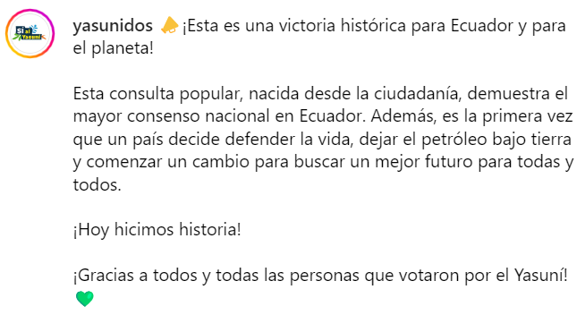 반면 야수니도스는 소셜미디어에 "오늘 우리는 역사를 만들었다”는 글을 올리고 이번 투표가 "에콰도르와 지구를 위한 역사적인 승리"라고 박수를 보냈다. 야수니도스와 환경·사회단체들의 걱정거리는 따로 있다. 이들은 채굴이 중단된 이후 석유회사가 시설을 방치하고 오염을 가중시키는 것을 막기 위해 모니터링 네트워크를 구축 중이다.