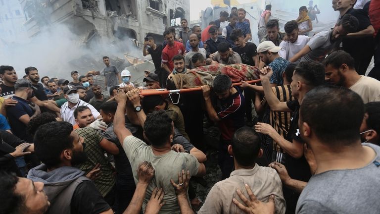 Palestinians remove a dead body from the rubble of a building after an Israeli airstrike Jebaliya refugee camp, Gaza Strip, Monday, Oct. 9, 2023. As the fifth Israel-Hamas war rages, growing more deadly and devastating, international and local monitoring groups in besieged Gaza have been unable to keep up.  Credit: AP/Ramez Mahmoud