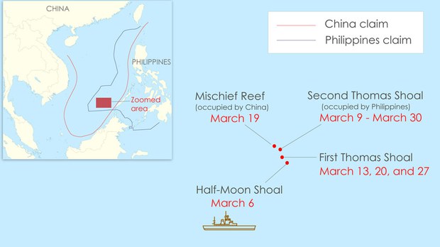그러다보니 필리핀은 계속 병사들을 주둔시키고, 중국은 주둔지로 가는 필리핀 측의 보급품 전달을 막고, 그 과정에서 충돌이 불거지는 일이 반복된다. 2014년, 2021년, 그리고 2023년에도 중국 해안 경비대 함정이 필리핀 보급선에 물대포를 발사했다. 그리고 이달 초 다시 중국 해안경비대가 필리핀 보급선에 물대포를 쐈다. 필리핀 측은 중국 외교관을 소환해 항의했다.