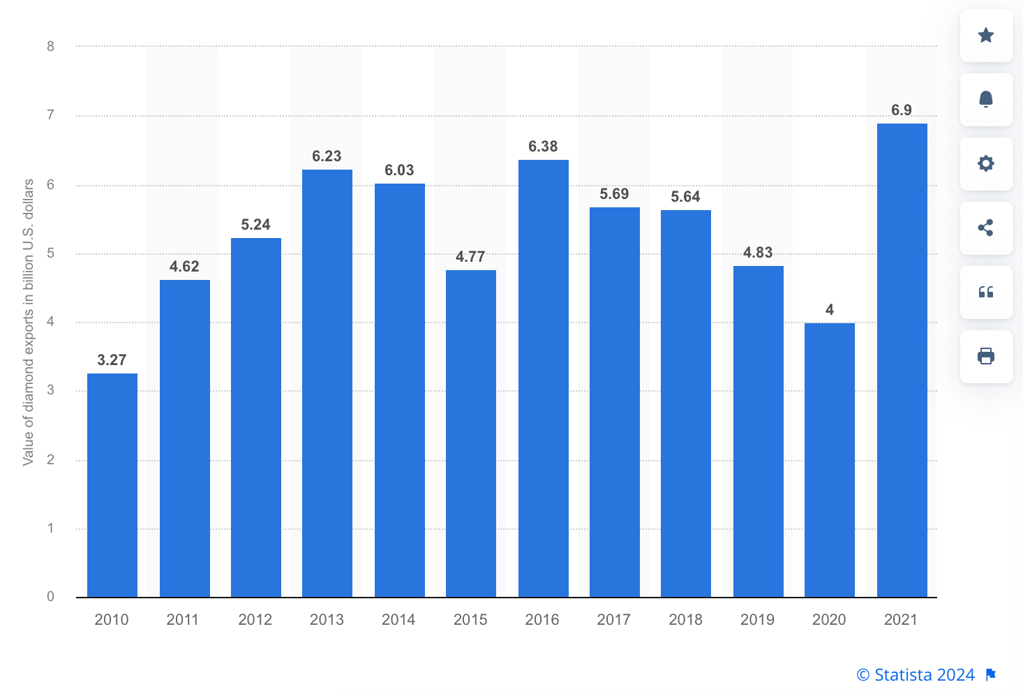 보츠와나가 이 과정에서 드비어스와 경쟁하는 벨기에 보석회사를 끌어들여 영리하게 협상을 하기도 했지만, 우크라이나 전쟁도 영향을 미쳤다. 러시아 기업 알로사는 드비어스와 함께 세계 다이아몬드 시장을 지배해왔다. 그런데 러시아가 우크라이나를 침공한 뒤, 시에라리온 등 서아프리카 분쟁지역에서 나온 보석을 가리키던 ‘블러디 다이아몬드’라는 딱지가 러시아산에도 붙게 됐다. 스페인 엘파이스의 표현을 빌면 시계 제조업자들이 고급 시계에 붙일 다이아몬드를 사기 위해 “송장에 러시아산이 아님을 명시하라고 요구하는” 상황이 된 것이다. 그 덕에 2020년 40억달러였던 보츠와나의 다이아몬드 수출액은 2021년 69억달러, 2022년 74억달러로 늘었다. 작년에는 세계의 수요가 줄면서 다소 감소한 것으로 보인다.
