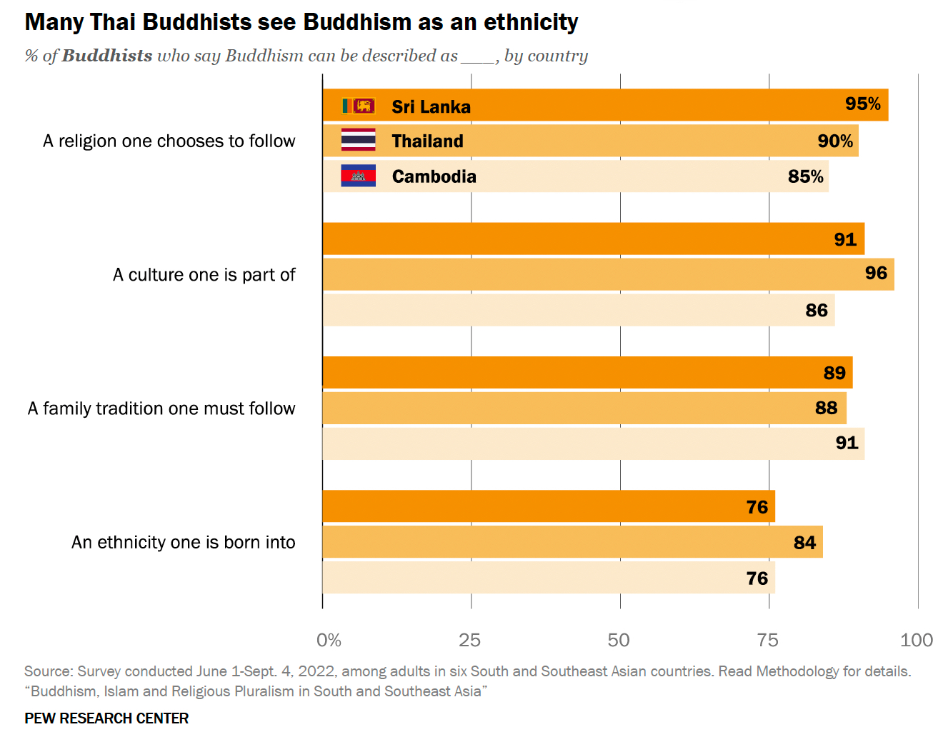 이슬람이 국가와 법 체계의 기반이어야 한다고 믿는 이슬람주의 경향은 9.11 테러 이후 이슬람권만이 아니라 세계의 이슈였다. 반면 불교도들의 종교적 정체성에 대한 관심은 상대적으로 적었다. 아시아 국가들의 정치에서 ‘불교’는 어떤 자리를 차지하고 있을까. 작년 9월 미국 퓨리서치센터가 동남아시아 6개국에서 종교에 대해 설문조사한 내용을 공개했다. 성인 70% 이상이 불교를 믿는 캄보디아, 스리랑카, 태국에서는 불교도 10명 중 9명 이상이 “불교를 믿는 것이 진정한 국가의 일원이 되는 데 중요하다”고 답했다. 실제로 이 나라들은 세속국가인지 의심스러울 정도로 정치에 불교를 활용하고 있다. 종교가 민족 정체성, 국가 정체성의 바탕이라고 믿는 것은 무슬림이나 불교도나 다를 바 없으며 다만 ‘다수’가 누구냐에 따라서만 달라진다는 것을 보여준다. 세 나라 불교도들은 불교를 “내가 속한 문화"이자 "따라야 하는 가족 전통"이라고도 말했다. 캄보디아 불교도 4명 중 3명은 불교를 ‘민족’과 연결지었다.