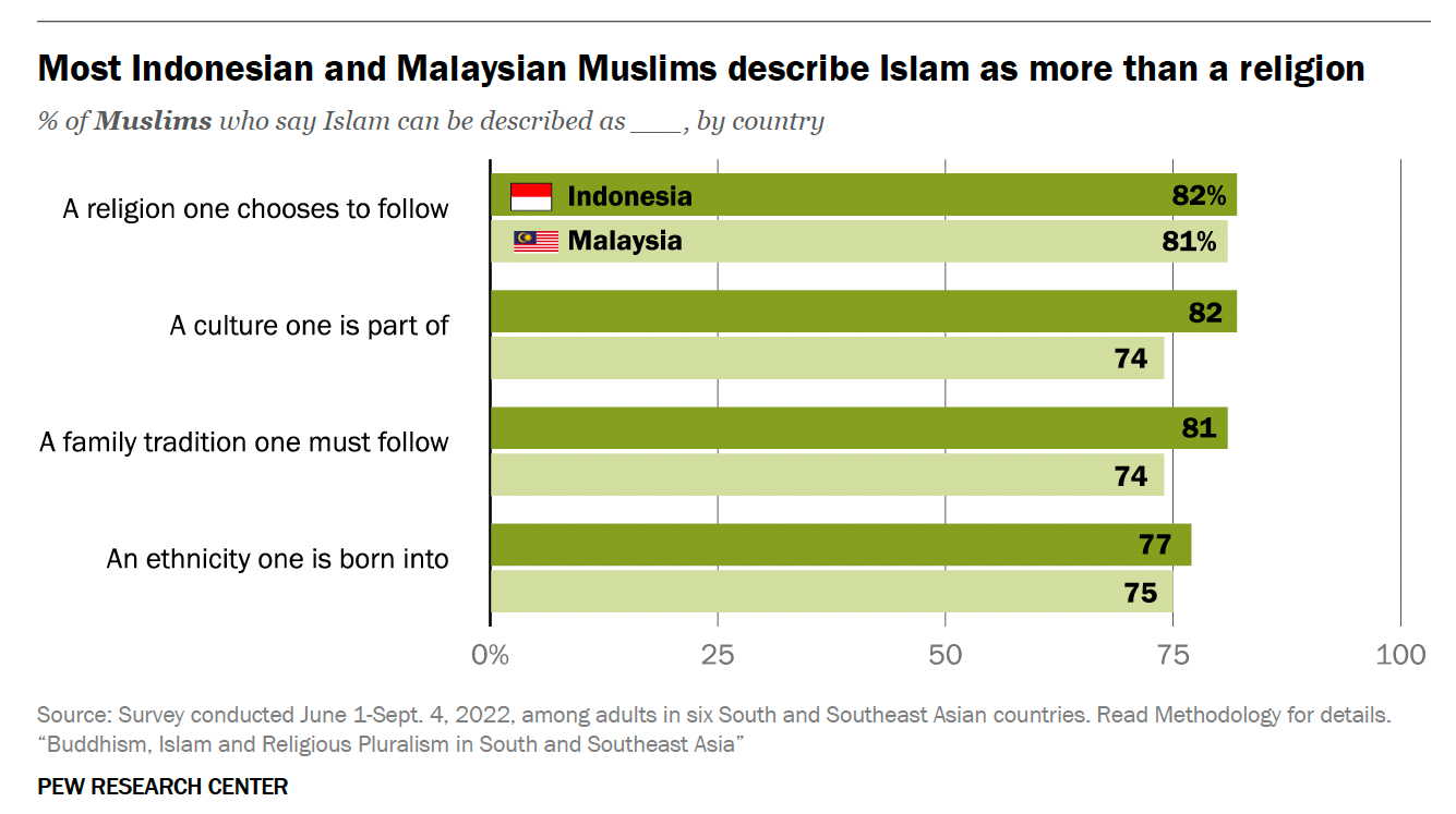 인도네시아와 말레이시아에서는 이슬람이 그 역할을 한다. 두 나라의 무슬림 역시 진정한 인도네시아인 또는 말레이시아인이 되기 위해서는 무슬림이 되는 것이 중요하다고 답했다. 말레이시아 무슬림 86%는 이슬람 종교법인 샤리아를 국가 법으로 삼아야 한다고 했다. 인도네시아의 64%보다도 훨씬 압도적인 비율이었다. 말레이시아 무슬림은 정치 지도자가 무슬림이어야 한다고 생각하는 비율도 더 높았다. 4명 중 3명은 이슬람을 ‘민족’과 동일시했다.
