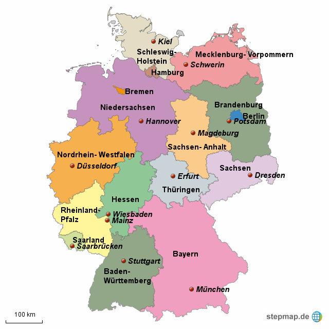 독일은 연방국가다. 외교 및 국방은 연방이 맡지만 나머지는 주와 연방의 공동 권한이다. 16개 주로 구성돼 있는데 베를린, 함부르크, 브레멘은 슈타트슈타텐 (도시 주)이고 나머지 13개 주는 플라헨란더 (지역 주)다. 2차 대전이 끝나고 1949년 미-영-프 통치 하의 서부 3개 지역을 합쳐서 독일연방공화국(서독)이 만들어졌다. 이 때는 10개 주였다. 1990년 독일이 통일되고 옛 동독 지역의 브란덴부르크, 작센, 작센-안할트, 튀링겐(튀링겐), 그리고 이름이 엄청 길고 어려운 메클렌부르크-보르포메른 5개주와 베를린이 더해져 16개 주가 됐다.
