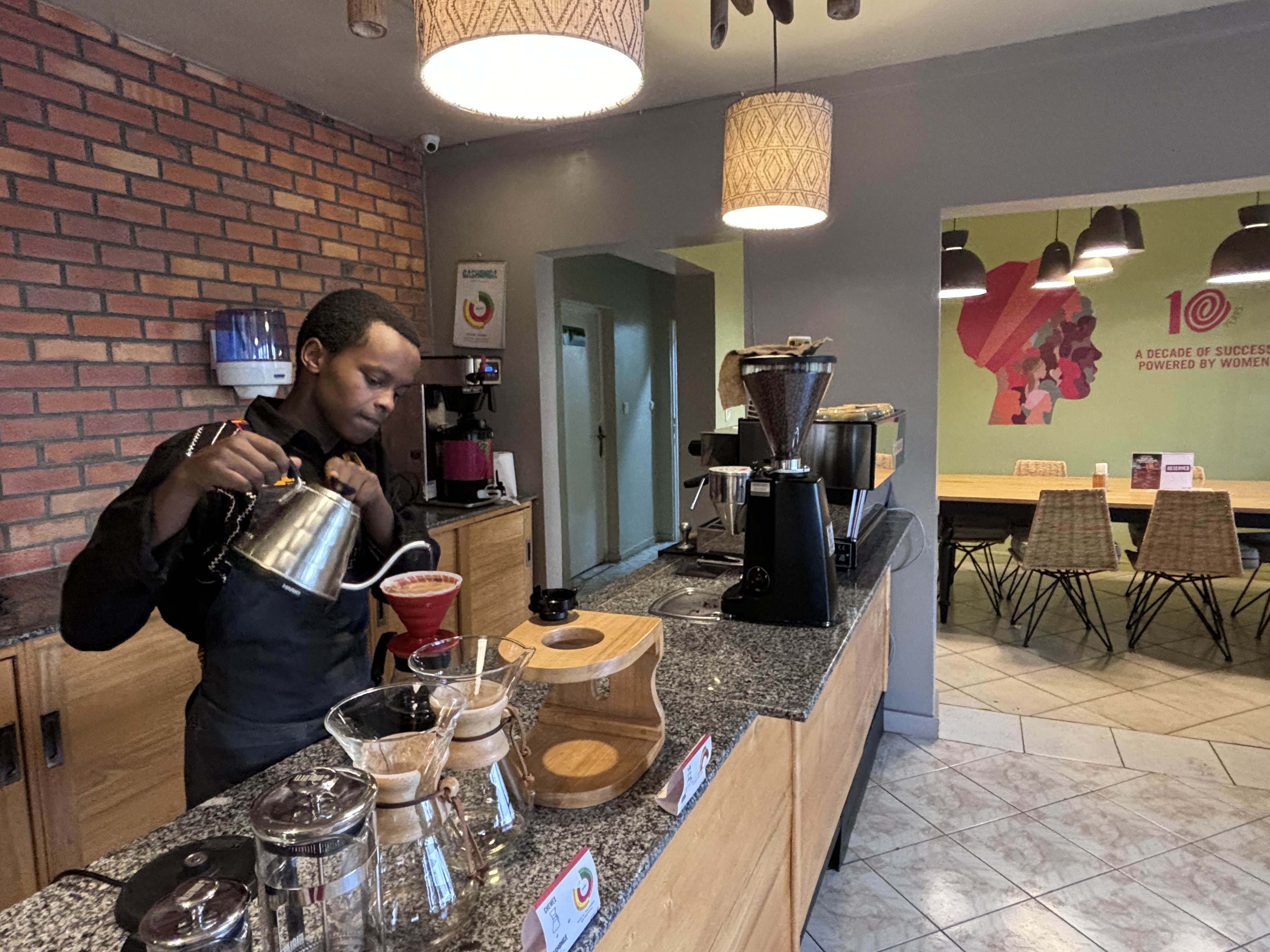 그래서 르완다는 여성들의 역량을 강화하는 것을 중시한다. 정부뿐 아니라 여성들 스스로의 노력도 크다. 세상 일에 의문을 가지라는 의미에서 브랜드 이름을 정한 ‘퀘스천’이라는 커피 회사가 있다. 협동조합 농장에서 직접 커피를 키워 가공하고 키갈리 시내 카페에서 커피와 원두를 판다. 서울 어느 카페와 비교해도 손색 없는 세련된 카페다. 퀘스천 커피는 농장부터 카페까지 여성들이 운영한다. 내전 때 다치거나 가족을 잃은 여성들이 만든 바구니 등 전통공예품 조합 같은 것들도 많다.